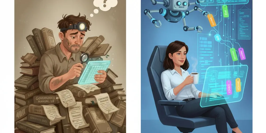 The gap is not that organizations lack policies. It is that policy lives in one place and data lives in another, with nothing connecting them automatically. Governance depends on humans remembering to apply it — and human processes do not scale, do not stay current, and do not survive organizational change.